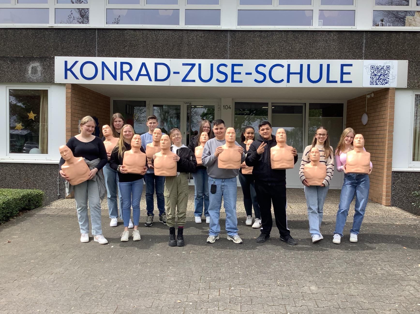 Die Grundsätze der Laienreanimation beherrschen die frisch ausgebildeten Schulsanitäter:innen der Konrad-Zuse-Schule Langenberg inzwischen aus dem Effeff und treten gut vorbereitet ihre Sanitätsdienste an, um bei kleinen und größeren Verletzungen zu helfen.